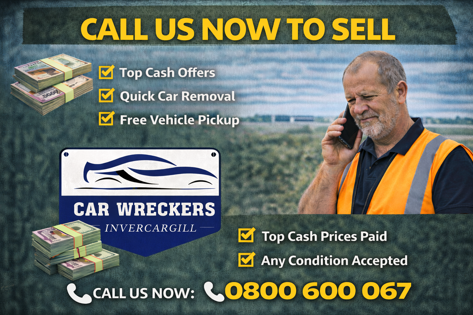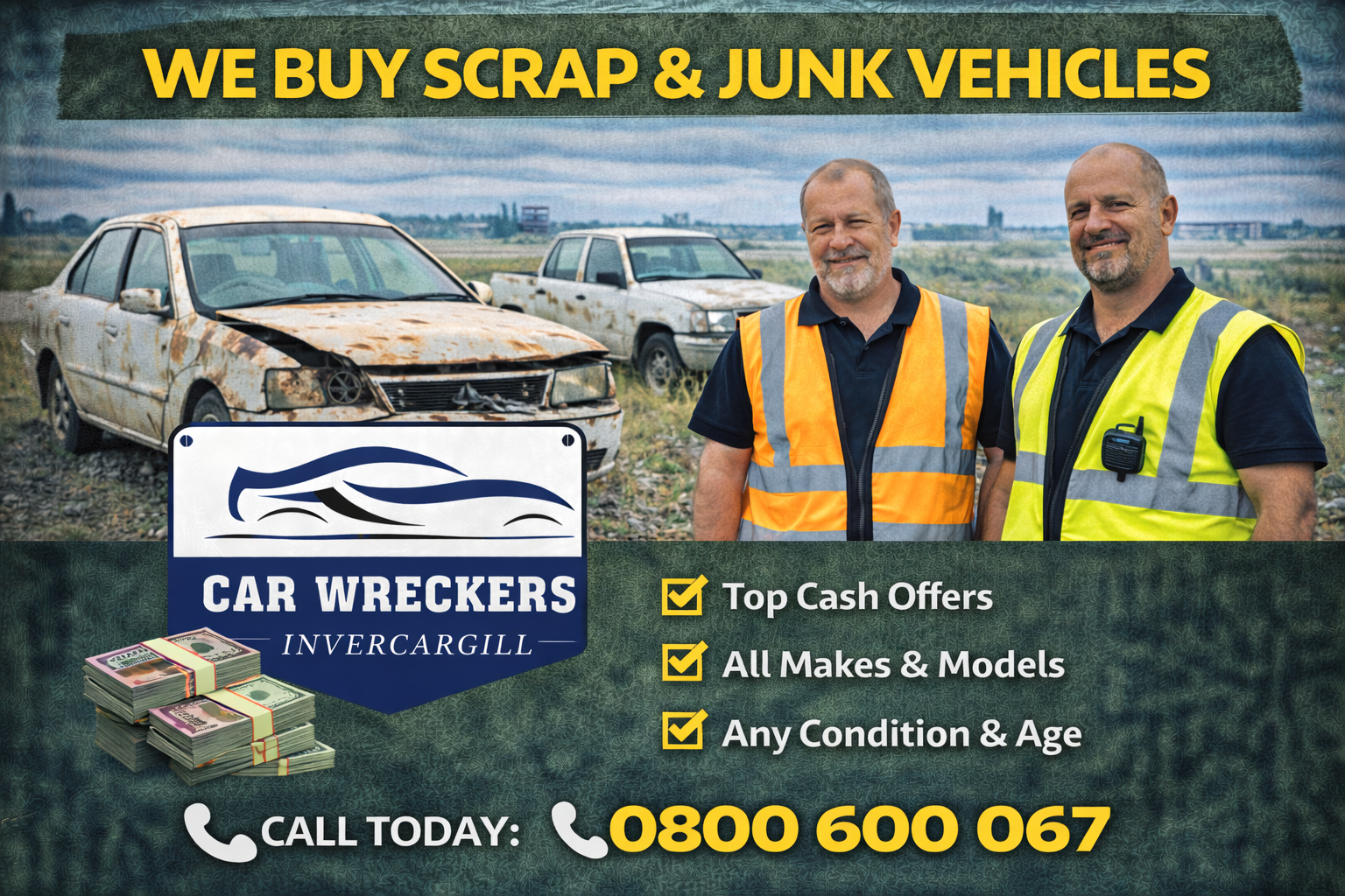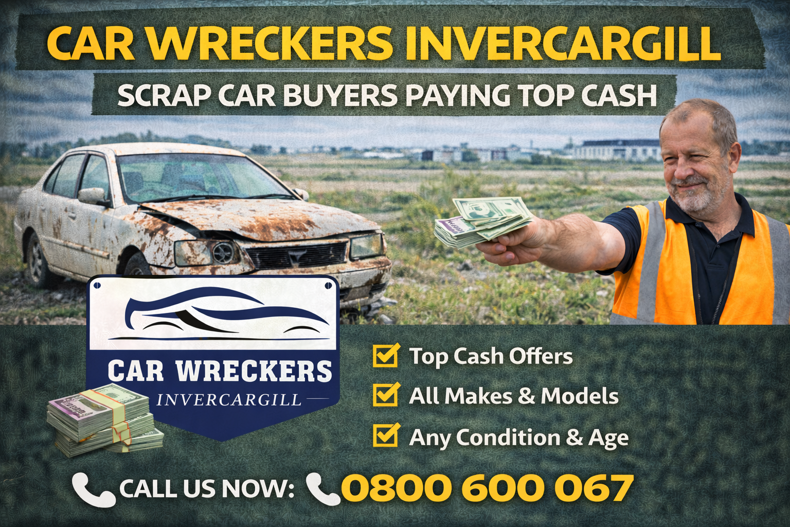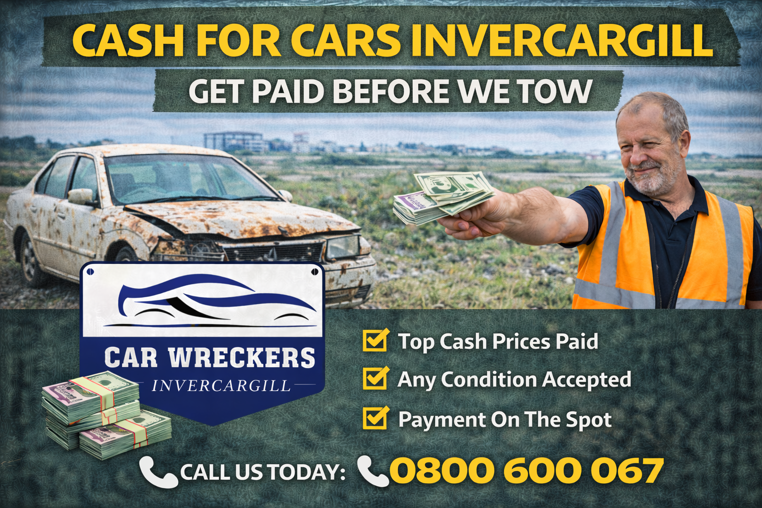 Car Wreckers Invercargill is your local specialist for scrap car removal and instant cash payments across Invercargill and Southland. We pay top cash on the spot for scrap, junk, damaged, old, and unwanted vehicles in any condition. Whether your vehicle is running or completely dead, we’ll buy it and remove it the same day with free towing